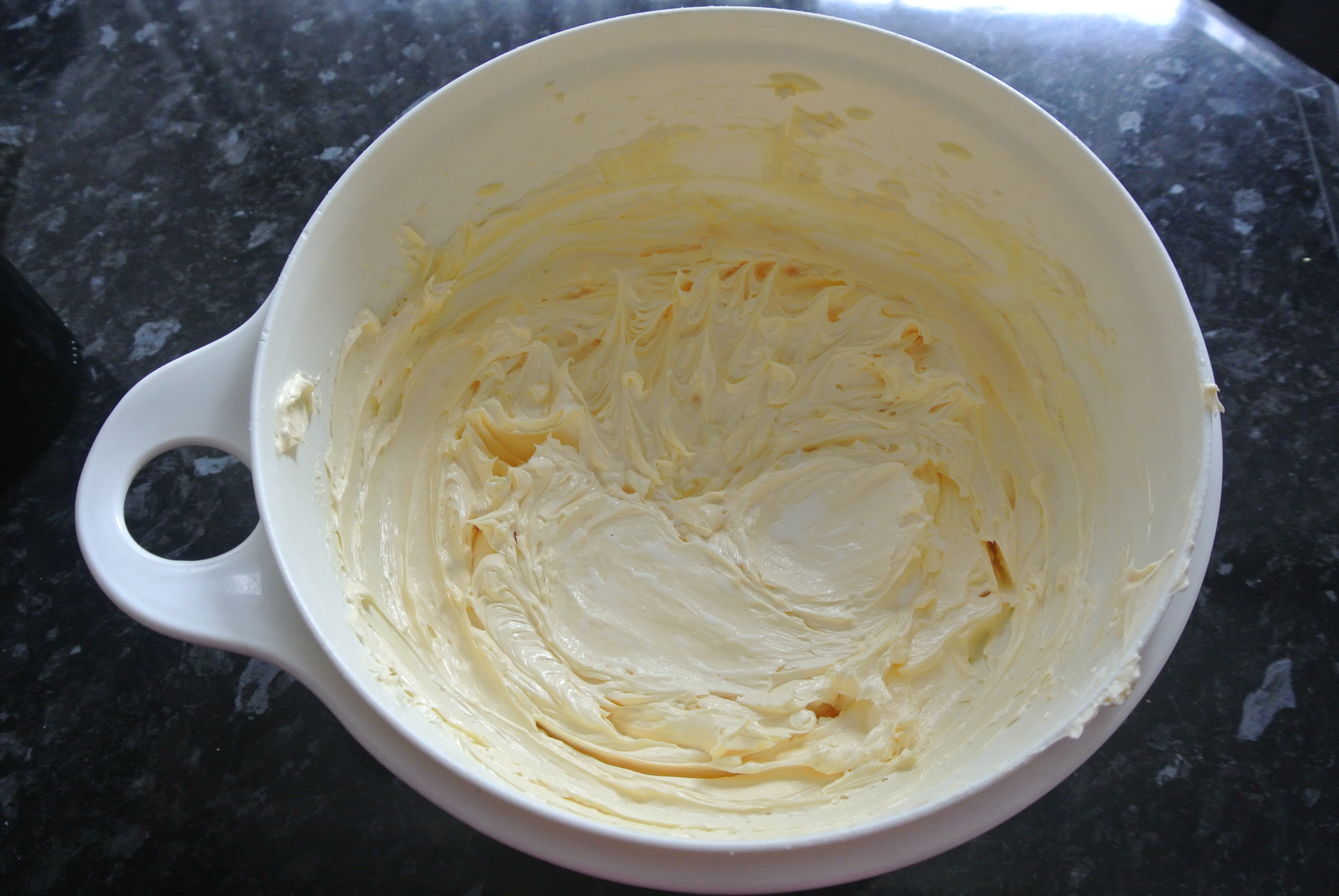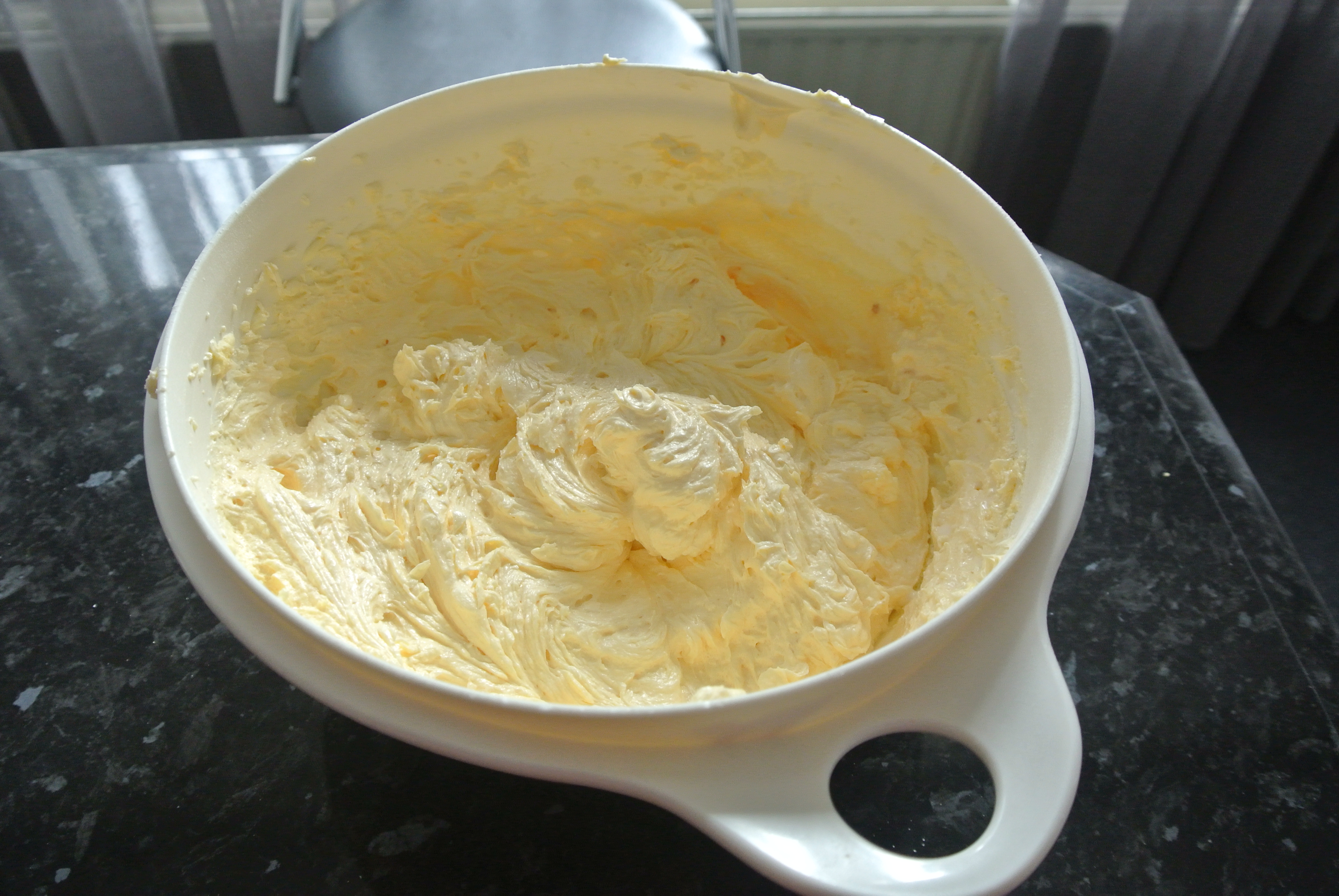 Mix met de mixer eerst boter, eieren en suiker door elkaar. Â zie hieronder:
