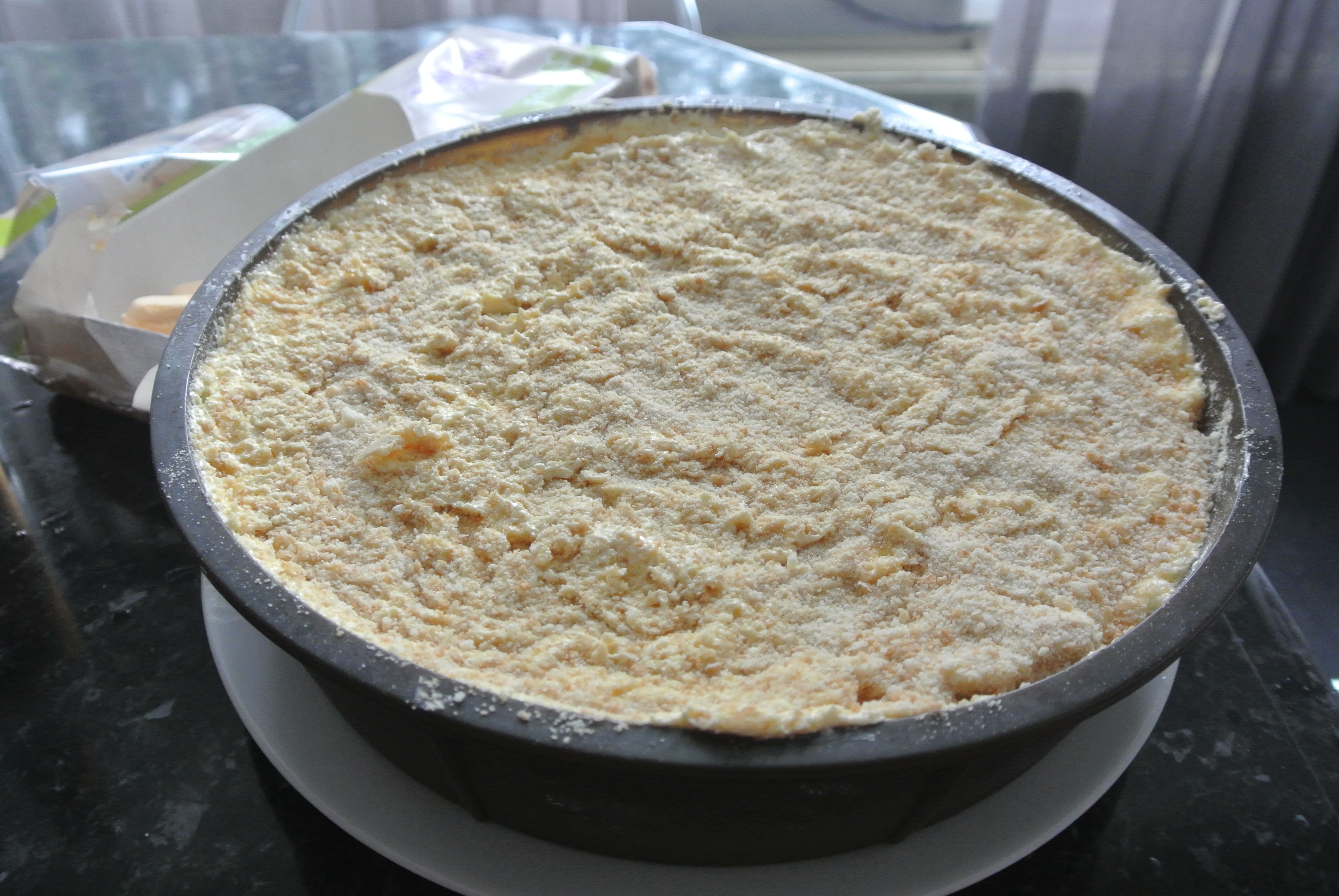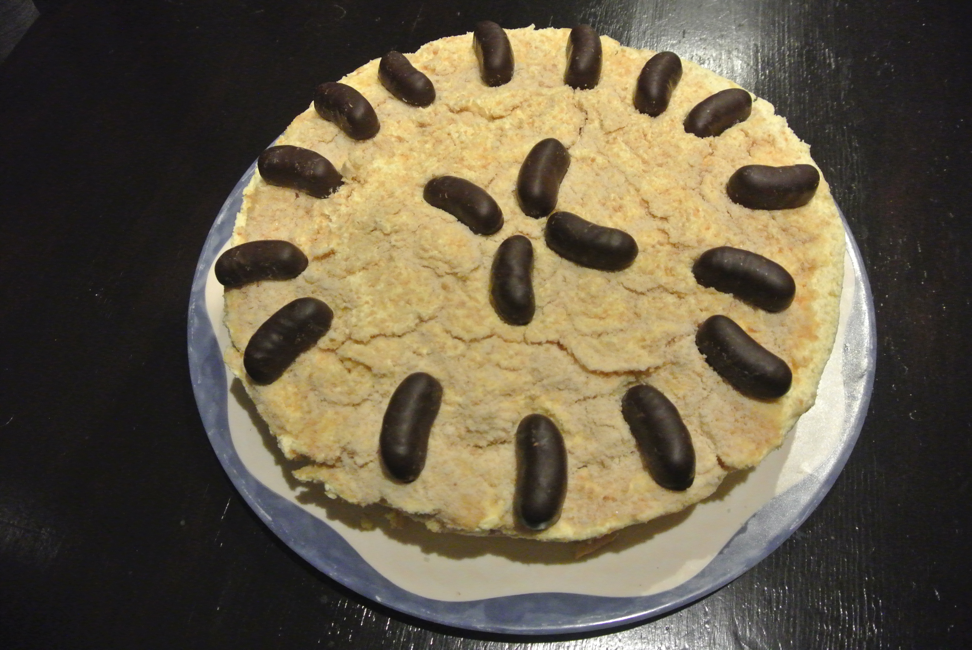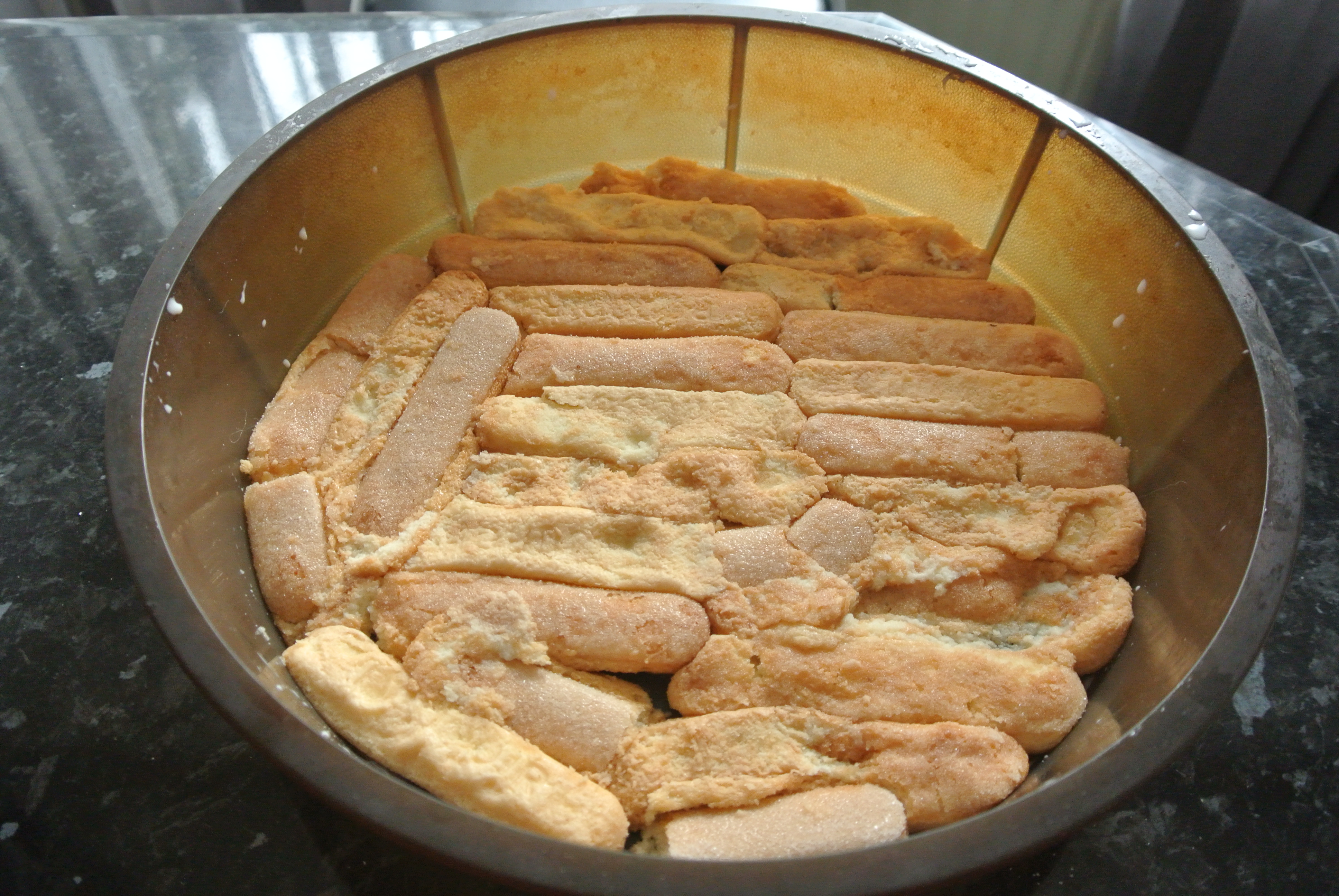 Vervolgens maak je lagen lange vingers in rum gedrenkt, room etc. in de vorm om het geheel af te sluiten met een laag kruimels van lange vingers.