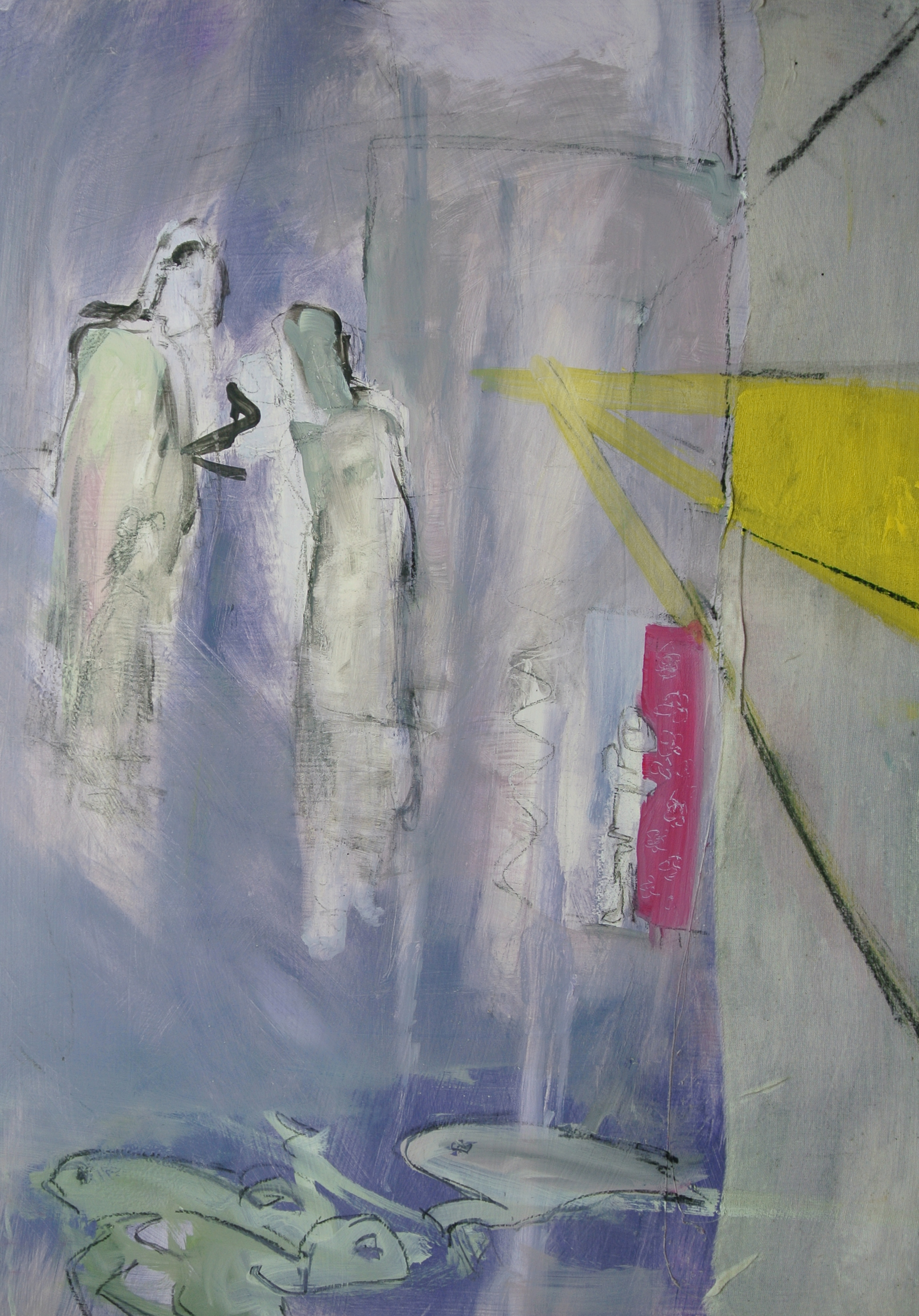 - Maak eerst een onderschildering van een licht grijs-blauwe verf op het schildersdoek.