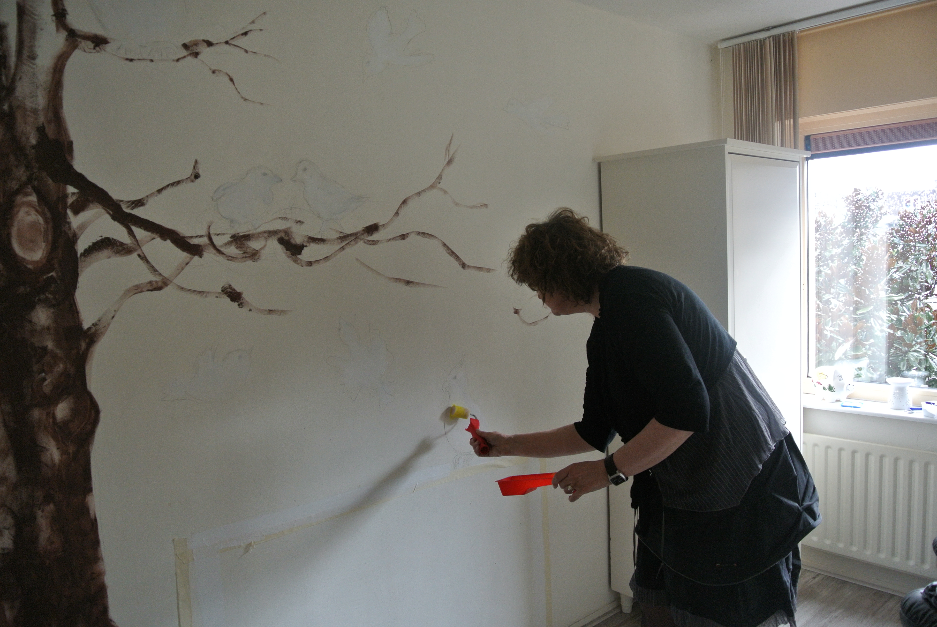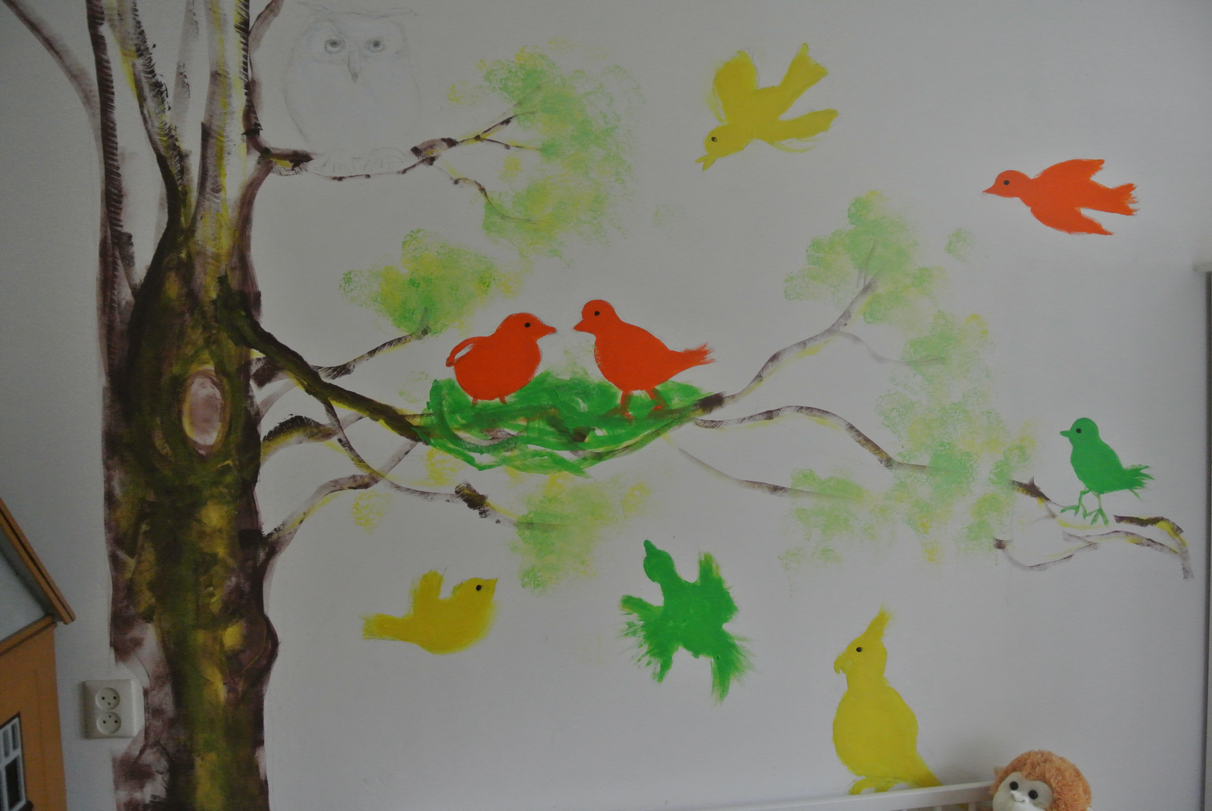 DE TEKENING ZIT OP DE MUUR EN DE STAM VAN DE BOOM IS GESCHILDERD..en..HET EERSTE VOGELTJE IS GESCHILDERD….