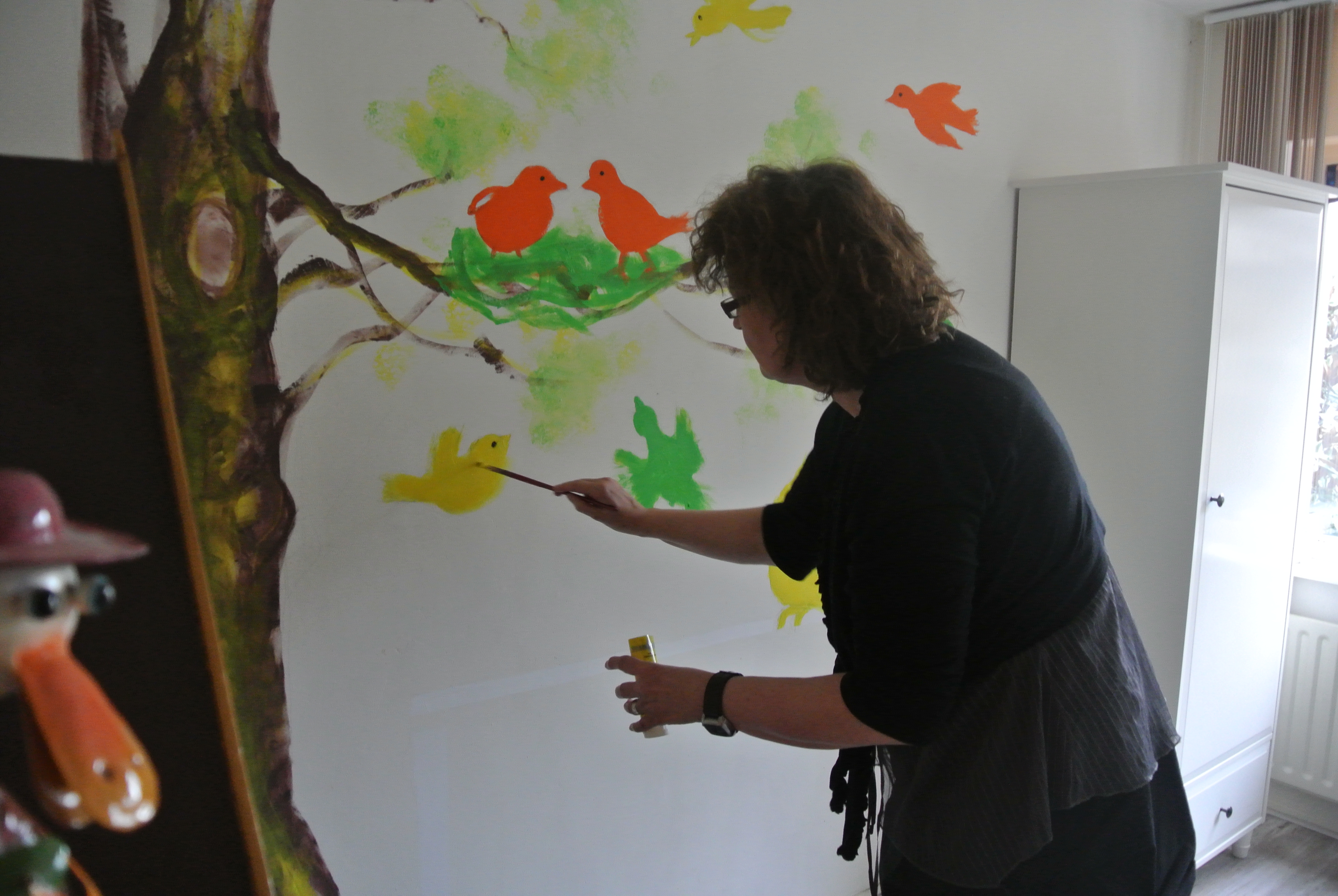 Wow Rita, wat supergaaf! Wat moet een kind zich hier welkom voelen. Man, wat ontroerend mooi. Die uil, die kleurige vogeltjes, die boom. Pure liefde. Als mijn dochter een kind krijgt, ga ik je bellen.