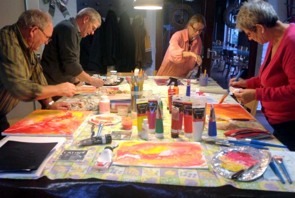 Zo zie ik mijn cursisten op de donderdagmiddagen en de workshops ook graag schilderen. En dat doen zij gelukkig ook.